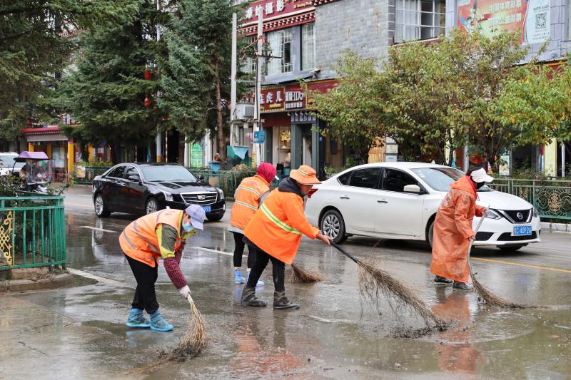 為盡快恢復(fù)城區(qū)潔凈容貌,香格里拉市和祥環(huán)??萍加邢挢?zé)任公司立即組織環(huán)衛(wèi)工人30名,抽調(diào)高壓水車(chē)2輛、掃地車(chē)4輛,積極開(kāi)展道路清淤工作,同時(shí)對(duì)下水道水口周邊的樹(shù)枝、雜物等進(jìn)行清理清運(yùn)。經(jīng)過(guò)近五小時(shí)的連續(xù)作業(yè),成功恢復(fù)道路暢通整潔。