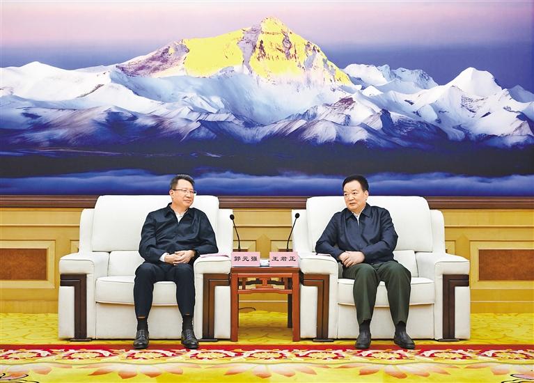 近日,自治區(qū)黨委書記王君正在拉薩與湖北省委常委、武漢市委書記郭元強一行座談。