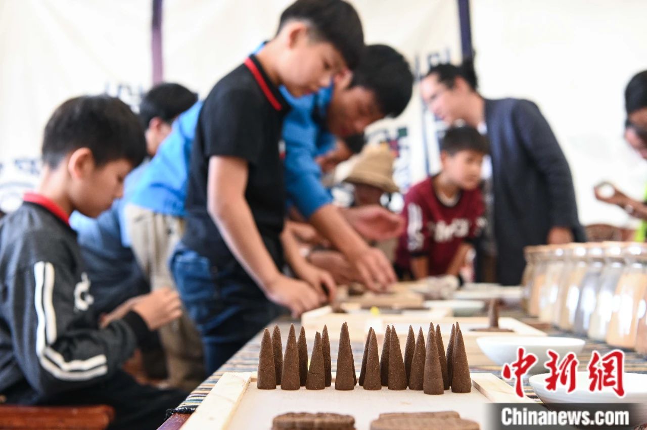圖為2019年7月6日,來自江蘇蘇州的小游客們?cè)诘录丶殷w驗(yàn)藏香手作。中新社記者 何蓬磊 攝