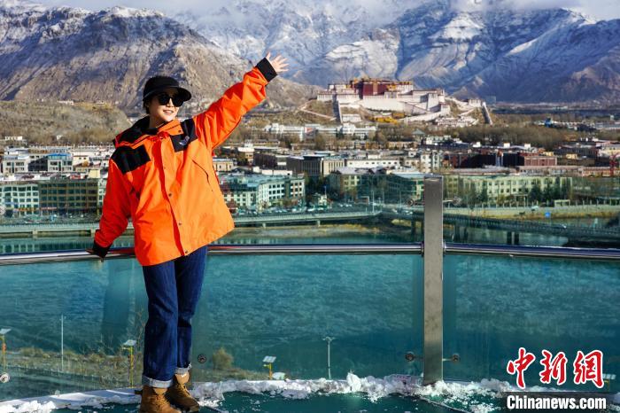 圖為游客在拉薩南山公園與布達(dá)拉宮雪景合影?!〗w波 攝