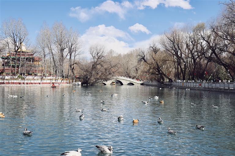距離羅布林卡3.6公里的宗角祿康公園,位于布達拉宮的背后,同樣深受拉薩市民群眾的喜愛,相較于羅布林卡,這里更為熱鬧。每到3月份,公園里的桃花、紅葉李、海棠競相綻放,在湖水的映襯下顯得嬌俏動人。公園內每隔一段距離便有涼亭、長椅供人們休息賞景,在這里,人們賞花、拍鳥,格外熱鬧。