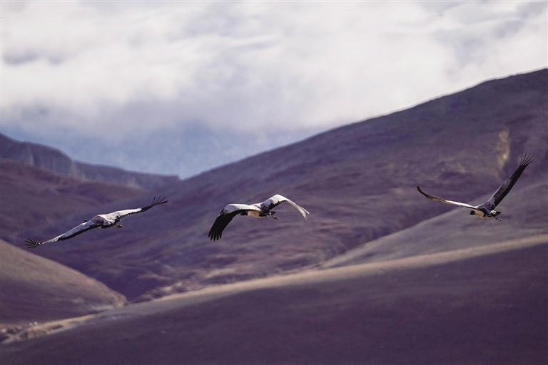 在西藏,黑頸鶴從越冬地到繁殖地有兩條線路:一條是拉薩到色林措,另一條則是從日喀則到色林措。整體來說,是從雅魯藏布江中游河谷黑頸鶴國家級自然保護區(qū)飛往色林措黑頸鶴保護區(qū),兩個保護區(qū)之間有一條固定的黑頸鶴遷徙路線,每年黑頸鶴會在3月中旬從越冬地雅江中游河谷及其支流拉薩河、年楚河流域的“一江兩河”地區(qū),飛去羌塘北部草原繁育后代;又會于11月中旬從繁殖地那曲的班戈縣、申扎縣、嘉黎縣,阿里的日土縣、普蘭縣,日喀則的昂仁縣,拉薩的當雄縣返回到越冬地。對于雅江中游河谷來說,它是冬候鳥;對于羌塘北部草原來說,它是夏候鳥。