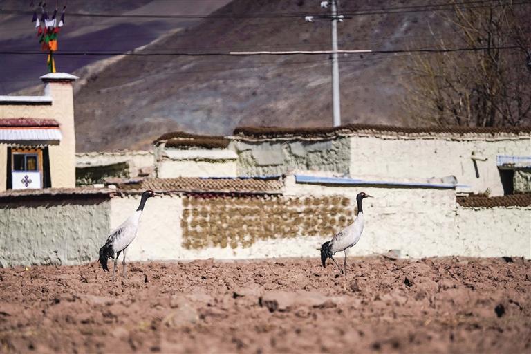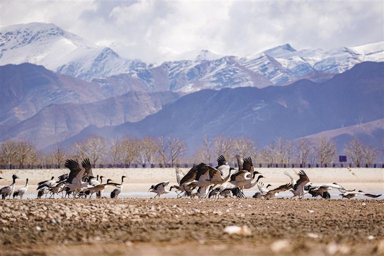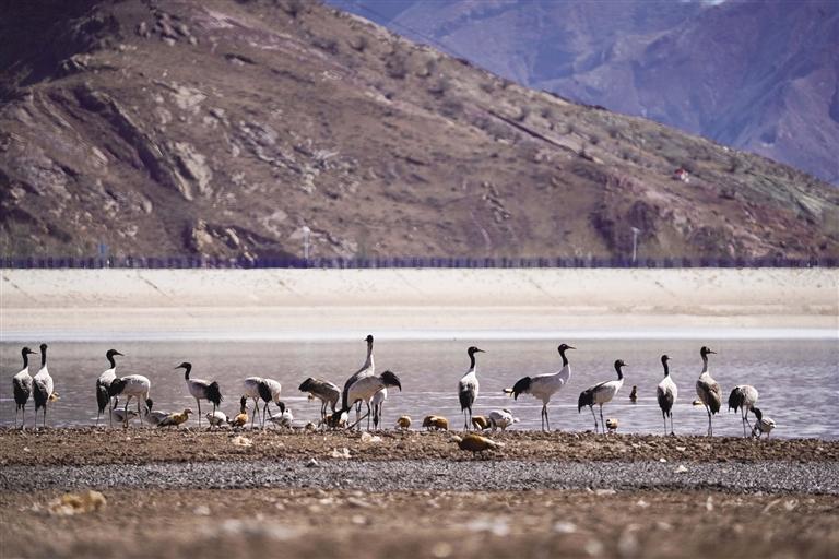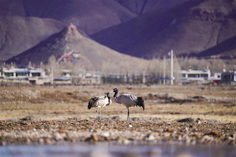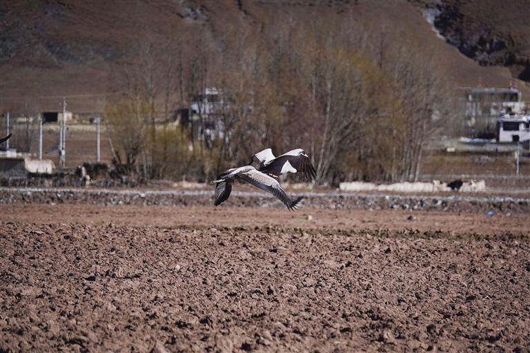 黑頸鶴是國家一級保護動物,在藏語中稱為“沖沖”。主要棲息在海拔2500米至5000米的高原、草甸、沼澤地帶。拉薩北部的林周縣平均海拔約4200米,是黑頸鶴的主要越冬地之一。最近這段時間,對拉薩市林周縣野保員們來說,一邊要忙自家的農(nóng)活,一邊還要巡查候鳥情況?!耙呀?jīng)有一小部分飛走了,估計再過半個月都會陸續(xù)飛走?!?月23日上午,野保員旦增告訴記者,在虎頭山水庫和卡孜水庫越冬的候鳥有一部分已經(jīng)飛走了。野保員口中的“飛走”便是遷徙,遷徙是候鳥的本能,一年一年,跟隨時間的召喚,完成兩次遷徙:繁殖和越冬。